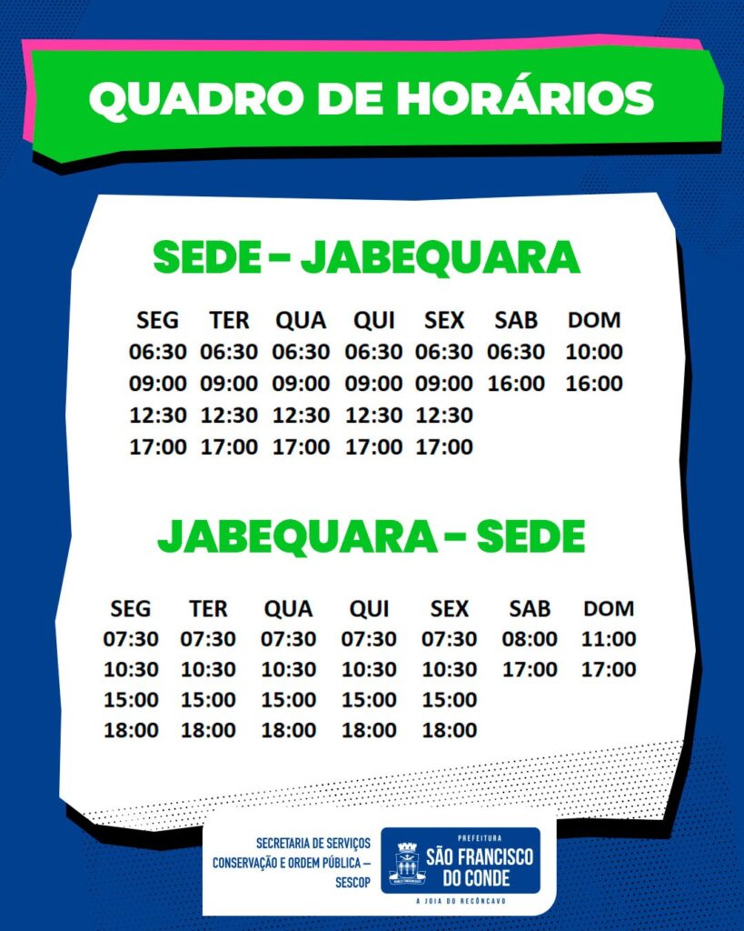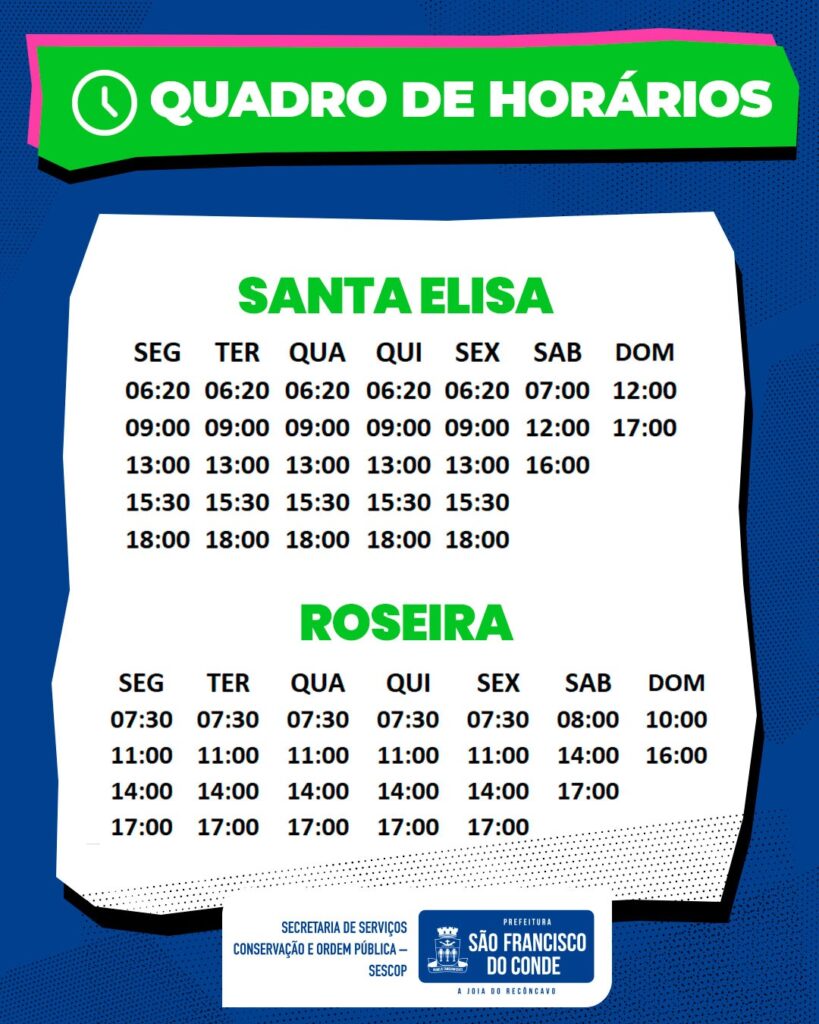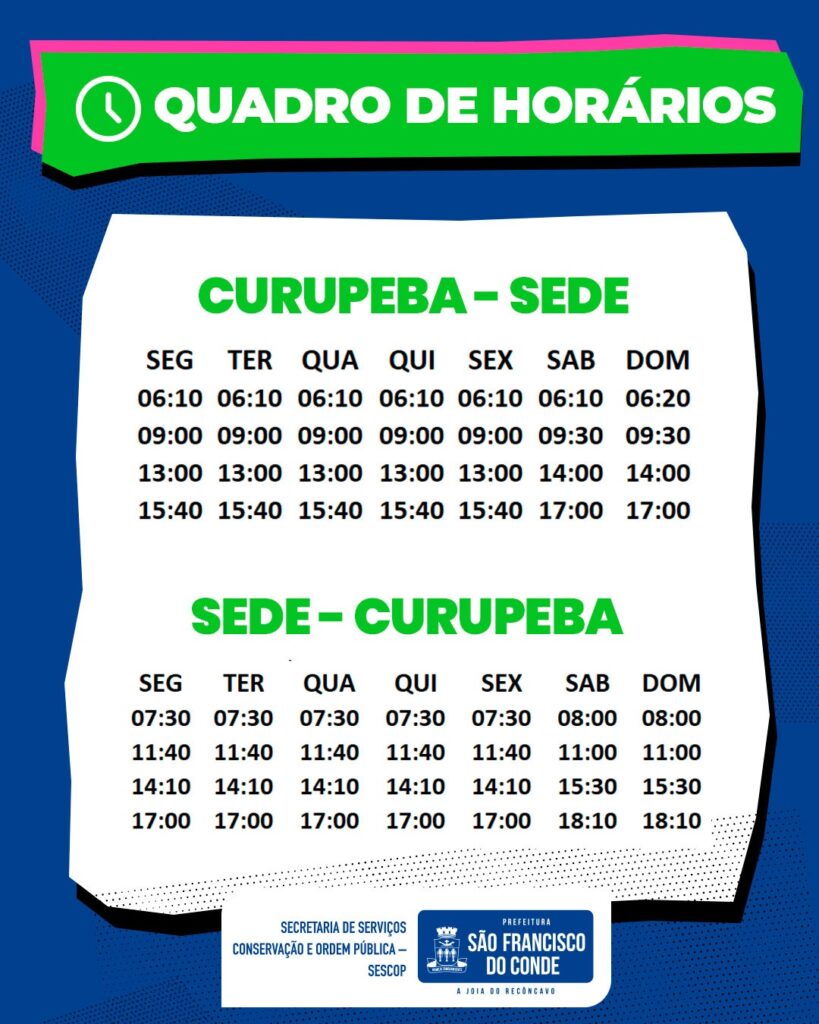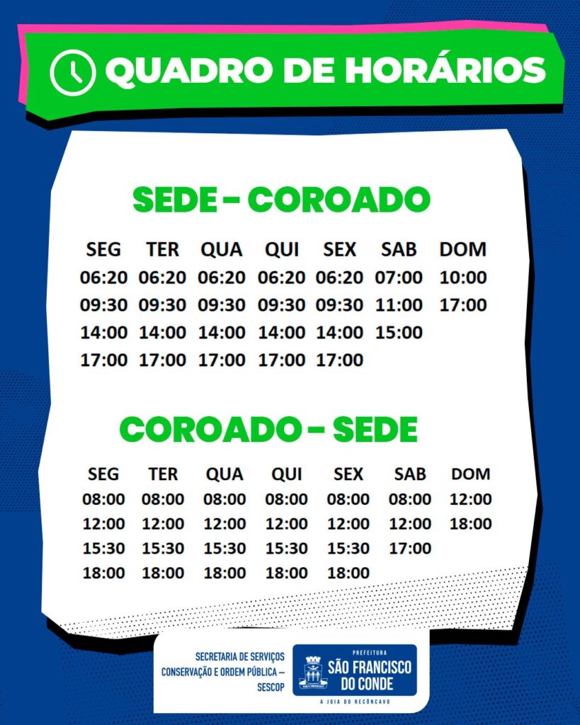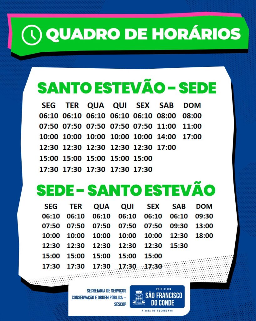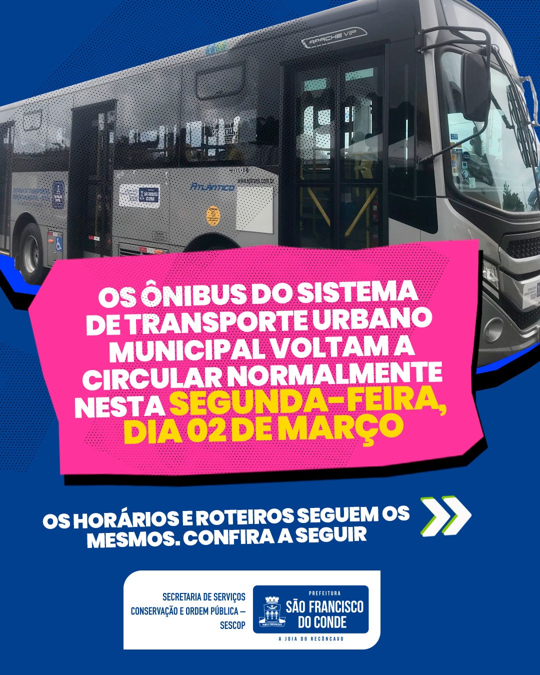 02/03/2026 Destaques , Destaques 2026A Prefeitura de São Francisco do Conde, por meio da Secretaria de Serviços, Conservação e Ordem Pública (SESCOP), informa à população que os ônibus do Sistema de Transporte Urbano Municipal voltam a operar normalmente nesta segunda-feira, 02 de março.