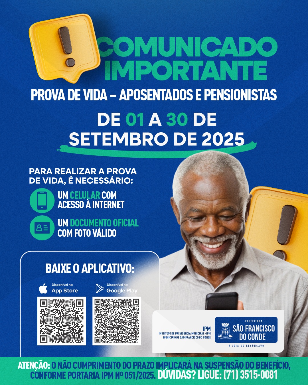 03/09/2025 Destaques , Destaques 2025A Prefeitura de São Francisco do Conde, por meio do Instituto de Previdência Municipal (IPM), informa que está aberto o período para a realização do recadastramento 2025. O procedimento é obrigatório para todos os aposentados e pensionistas vinculados ao instituto e deve ser realizado de 01 a 30 de setembro de 2025.