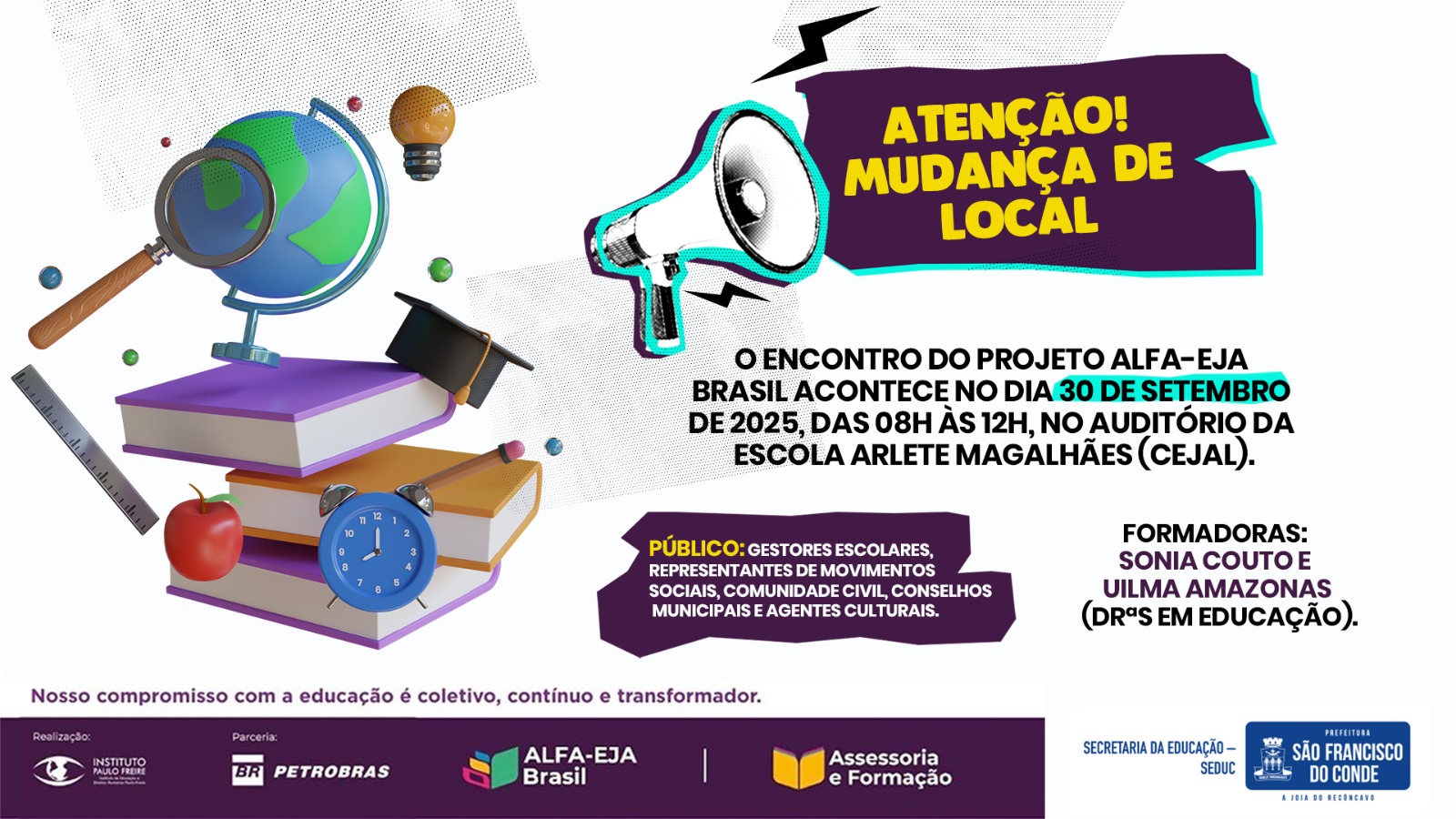 A Prefeitura de São Francisco do Conde, por meio da Secretaria Municipal da Educação (SEDUC), dará início ao Ciclo Formativo do Projeto ALFA-EJA BRASIL no dia e 30 de setembro, de forma presencial, no auditório da Escola Arlete Magalhães (CEJAL).