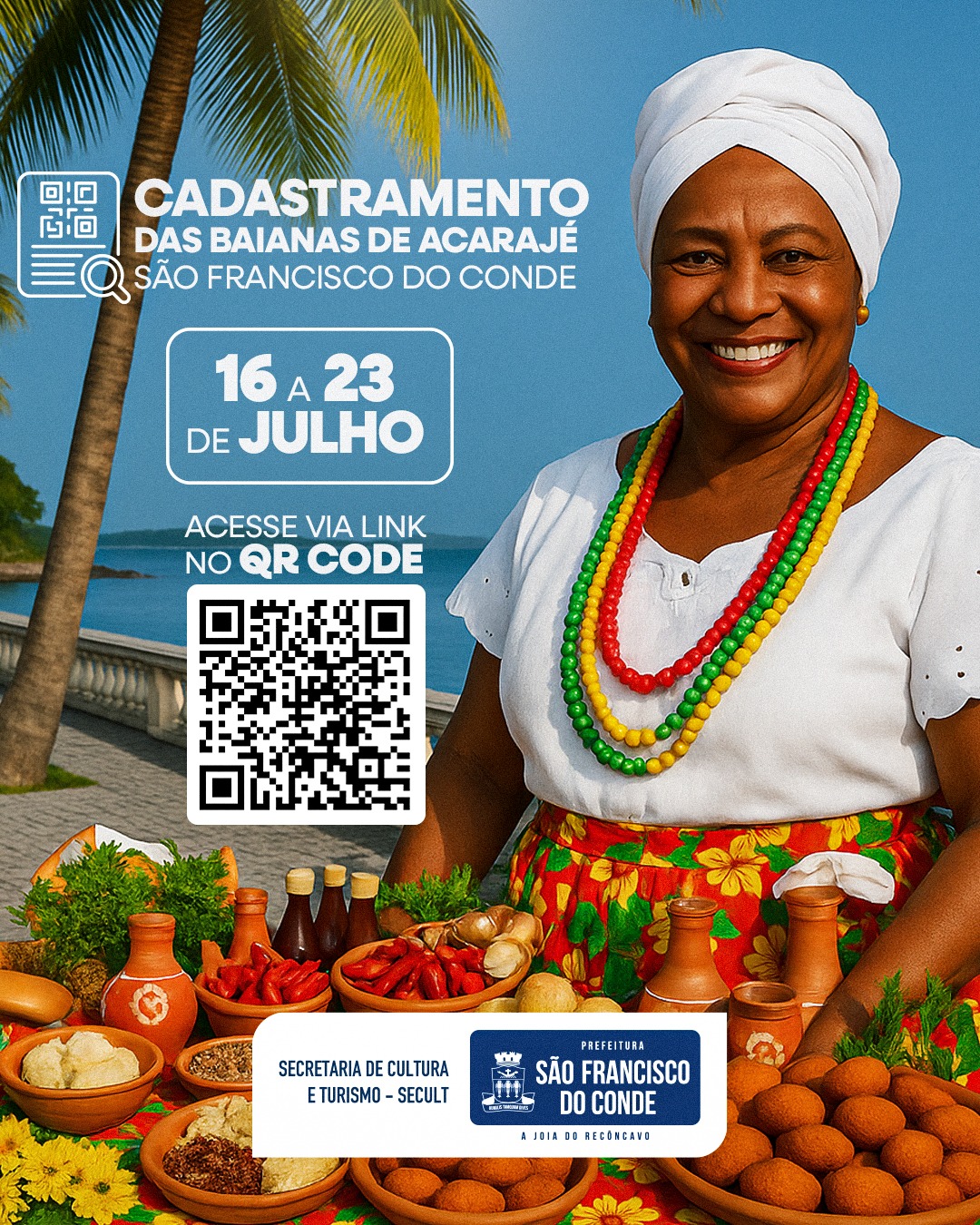 16/07/2025 Destaques , Destaques 2025A Prefeitura de São Francisco do Conde, por meio da Secretaria Municipal de Cultura e Turismo (SECULT) convida as baianas (os) de acarajé do município a participar do cadastramento que tem início nesta quarta-feira, 16.
