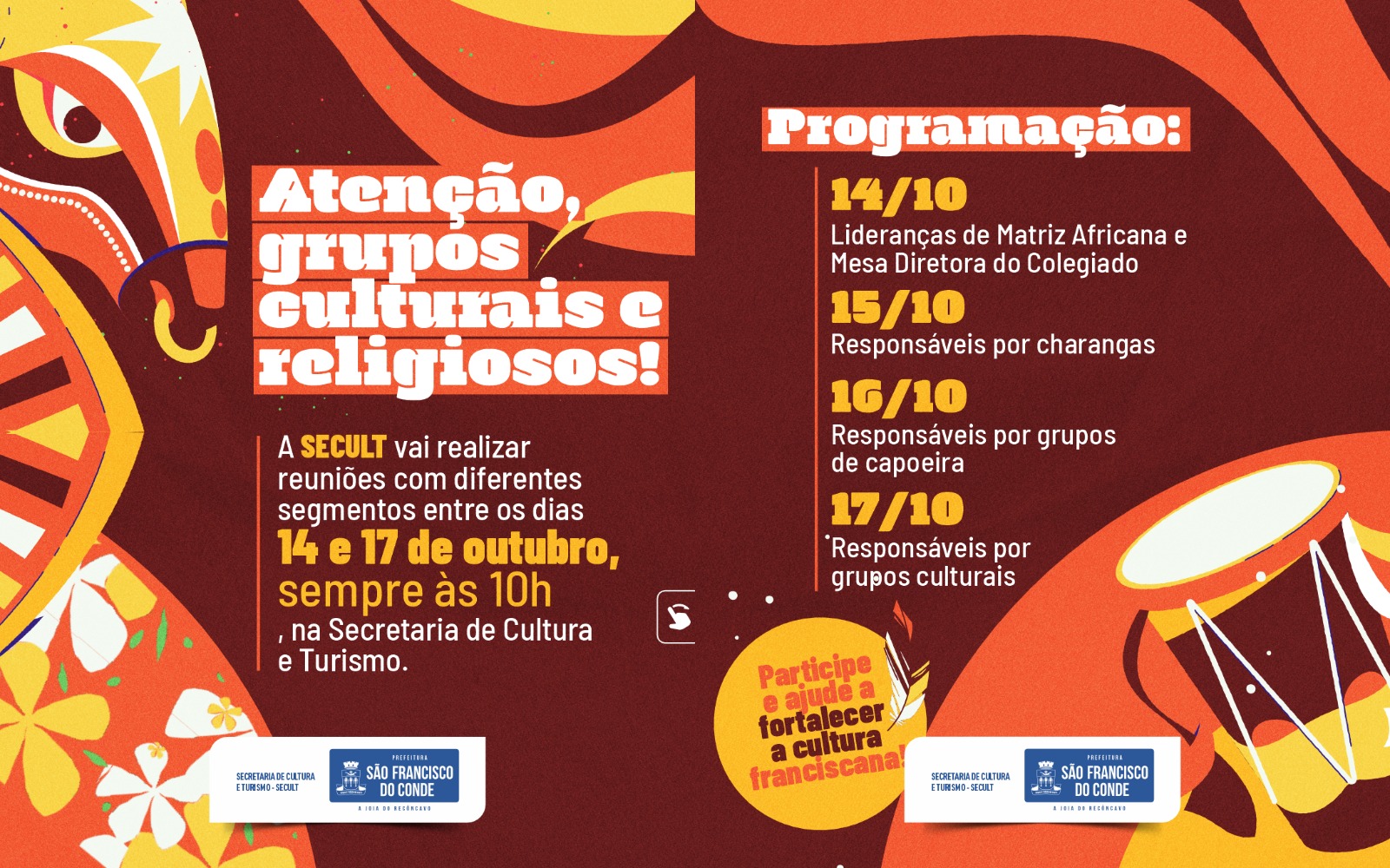 11/10/2025 Destaques , Destaques 2025A Prefeitura de São Francisco do Conde, por meio da Secretaria de Cultura e Turismo (SECULT), vai realizar entre os dias 14 e 17 de outubro uma série de reuniões com representantes de diferentes segmentos culturais e religiosos do município. O objetivo é dialogar com as lideranças, ouvir demandas e fortalecer a construção coletiva das ações culturais franciscanas.