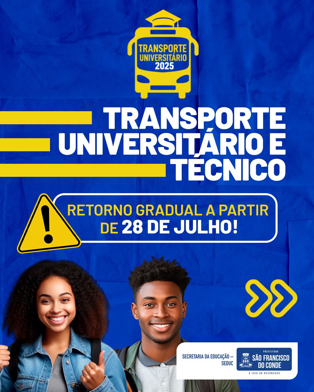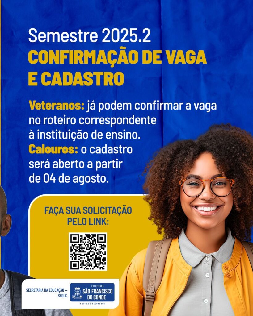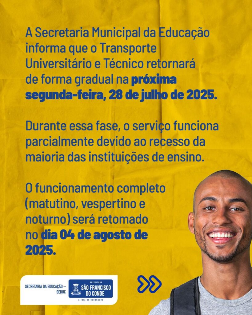 25/07/2025 Destaques , Destaques 2025A Prefeitura de São Francisco do Conde, por meio da Secretaria da Educação (SEDUC), informa que o Transporte Universitário e Técnico retornará de forma gradual a partir da próxima segunda-feira, 28 de julho de 2025. Neste período, o serviço funcionará parcialmente, devido ao recesso da maioria das instituições de ensino.